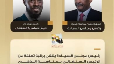 السيد رئـيــس مجلــس السيـــادة يتلقى برقية تهنئة من رئيس جمهورية السنغال بمناسبة الذكرى الــ70 للاستقلال