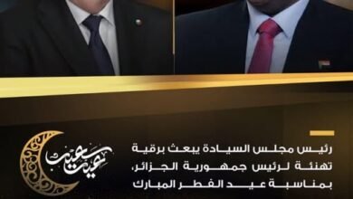 رئيس مجلس السيادة الانتقالي الفريق أول الركن عبدالفتاح البرهان يبعث برقية تهنئة لرئيس جمهورية الجزائر صاحب الفخامة عبد المجيد تبون ، بمناسبة عيد الفطر المبارك .