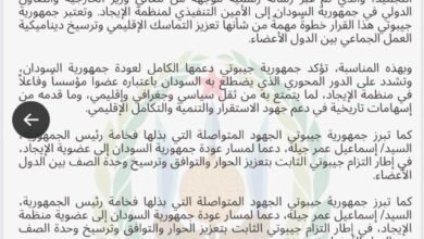 جيبوتي ترحب بقرار عودة السودان لمنظمة الإيقاد