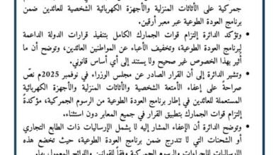 الجمارك تؤكد الإعفاء الكامل على الامتعة الشخصية_الاثاثات المنزلية والاجهزة الكهربائية المستعملة ضمن برنامج العودة الطوعية