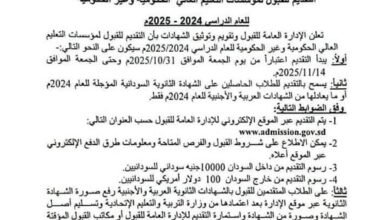 فتح باب التقديم للقبول بمؤسسات التعليم العالي الحكومية وغير الحكومية للعام الدراسي 2024 – 2025م اعتبارا من بعد غد الجمعة