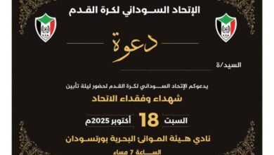 متابعات صوت الشارع يقيم الاتحاد السوداني لكرة القدم في الساعة السابعة مساء اليوم بنادي هيئة الموانئ ببورتسودان، تأبين لشهدائه وفقدائه…