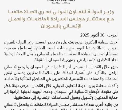 وأكدت سعادة وزير الدولة للتعاون الدولي، خلال الاتصال، حرص دولة قطر على متابعة الأوضاع الإنسانية في السودان، ودعم الجهود الدولية الرامية إلى حماية المدنيين وتسهيل وصول المساعدات الإنسانية إلى مستحقيها.