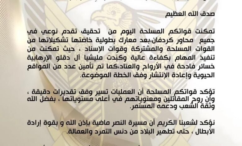 تمكنت قواتكم المسلحة اليوم من تحقيق تقدم نوعي في جميع محاور كردفان، بعد معارك بطولية خاضتها تشكيلاتها من القوات المسلحة والمشتركة وقوات الإسناد، حيث تمكنت من تنفيذ المهام بكفاءة عالية وكبّدت مليشيا آل دقلو الإرهابية خسائر فادحة في الأرواح والعتاد، كما تم تأمين عدد من المواقع الحيوية وإعادة الإنتشار وفق الخطة الموضوعة.