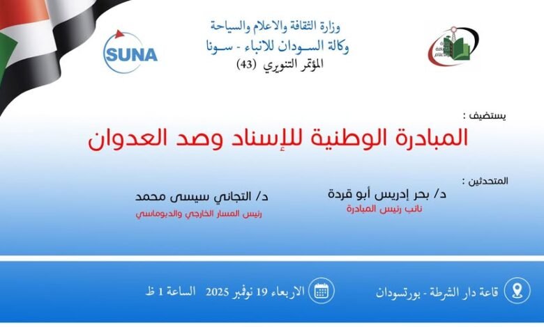 يستضيف المؤتمر التنويري رقم 43 لوزارة الثقافة والإعلام والسياحة، الذي تنظمه وكالة السودان للأنباء في الواحدة من ظهر غدا الاربعاء بدار الشرطة بورتسودان، المبادرة الوطنية للإسناد وصد العدوان.