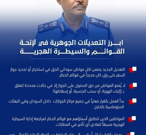 في إطار إنفاذ توجيهات رئيس مجلس السيادة الانتقالي وتجسيداً لالتزام الدولة بحماية حقوق المواطنة أعلن العميد شرطة/ فتح الرحمن محمد التوم الناطق الرسمي باسم قوات الشرطة عن صدور تعديلات قانونية هامة في “لائحة القوائم والسيطرة الهجرية” تهدف إلى تسهيل إجراءات الهوية ومنح السيادة الوطنية حقها المستحق لكل سوداني