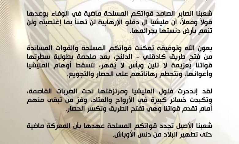 With Allah’s help and guidance, your Sudanese Armed Forces and supporting forces have succeeded in opening the Kadugli-Dilling road, after a heroic battle marked by unwavering resolve and indomitable might from our forces, shattering the illusions of the militia and its allies, and destroying their bets on the siege and starvation.