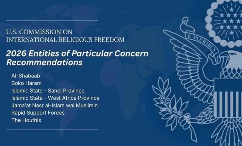 دفع لجنة الولايات المتحدة للحرية الدينية الدولية إلى التوصية بتصنيف قوات الدعم السريع لعام 2026 “الكيانات التي تثير قلقاً خاصاً” (EPC) (EPCs) وهي كيانات فاعلة غير حكومية – مثل الجماعات الإرهابية – التي ترتكب انتهاكات جسيمة ومنهجية للحرية الدينية. وقد صنفتها وزارة الخارجية بناءً على توصيات لجنة الولايات المتحدة للحرية الدينية الدولية (USCIRF)، وتشمل هذه الكيانات جماعات مثل حركة الشباب، وبوكو حرام ، والحوثيين، وتنظيم داعش.