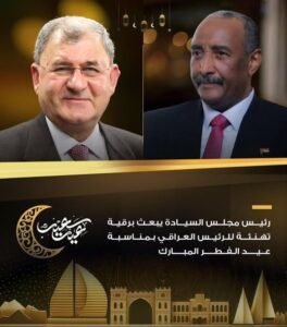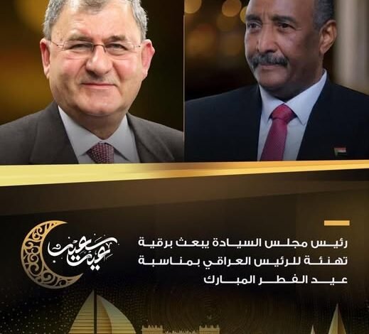 رئيس مجلس السيادة الانتقالي الفريق أول الركن عبدالفتاح البرهان يبعث برقية تهنئة للرئيس العراقي صاحب الفخامة عبداللطيف جمال رشيد، بمناسبة عيد الفطر المبارك