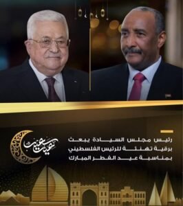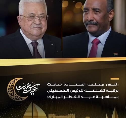 رئيس مجلس السيادة الانتقالي الفريق أول الركن عبدالفتاح البرهان يبعث برقية تهنئة للرئيس الفلسطيني صاحب الفخامة محمود عباس، بمناسبة عيد الفطر المبارك