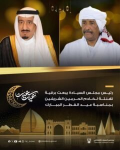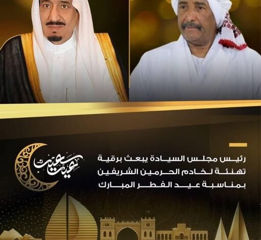 رئيس مجلس السيادة الانتقالي الفريق أول الركن عبدالفتاح البرهان يبعث برقية تهنئة لخادم الحرمين الشريفين صاحب الجلالة الملك سلمان بن عبدالعزيز ، بمناسبة عيد الفطر المبارك