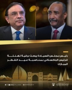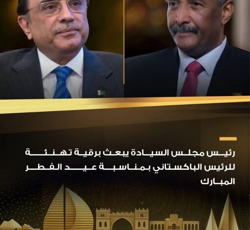 رئيس مجلس السيادة الانتقالي الفريق أول الركن عبدالفتاح البرهان يبعث برقية تهنئة لرئيس جمهورية باكستان الإسلامية صاحب الفخامة آصف علي زرداري، ، بمناسبة عيد الفطر المبارك