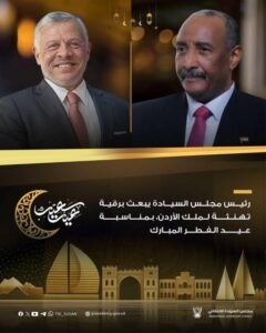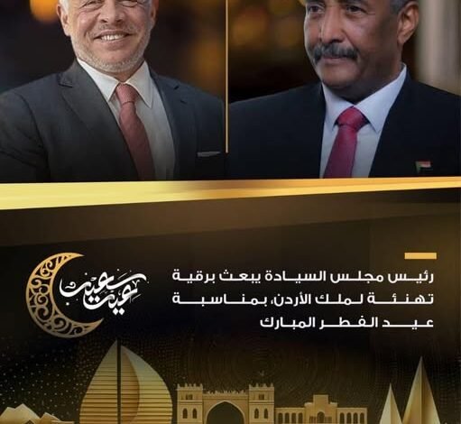 رئيس مجلس السيادة الانتقالي الفريق أول الركن عبدالفتاح البرهان يبعث برقية تهنئة لملك الأردن صاحب الجلالة الملك عبدالله الثاني بن الحسين ، بمناسبة عيد الفطر المبارك .
