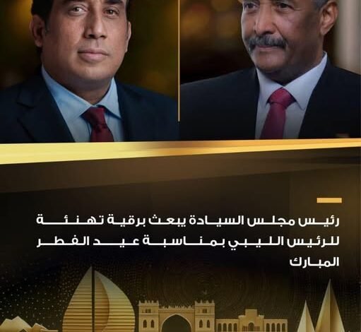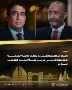 رئيس مجلس السيادة الانتقالي الفريق أول الركن عبدالفتاح البرهان يبعث برقية تهنئة لرئيس المجلس الرئاسي الليبي صاحب الفخامة محمد المنفي ، بمناسبة عيد الفطر المبارك .