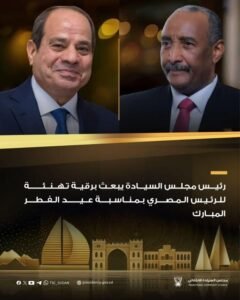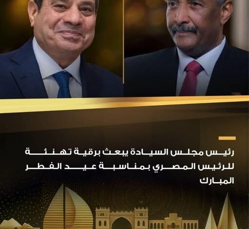 رئيس مجلس السيادة الانتقالي الفريق أول الركن عبدالفتاح البرهان يبعث برقية تهنئة للرئيس المصري صاحب الفخامة عبدالفتاح السيسي ، بمناسبة عيد الفطر المبارك