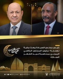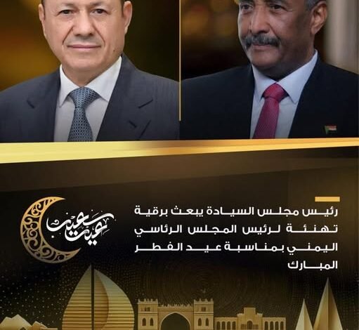 رئيس مجلس السيادة الانتقالي الفريق أول الركن عبدالفتاح البرهان يبعث برقية تهنئة لرئيس مجلس القيادة الرئاسي اليمني صاحب الفخامة رشاد محمد العليمي ، بمناسبة عيد الفطر المبارك
