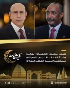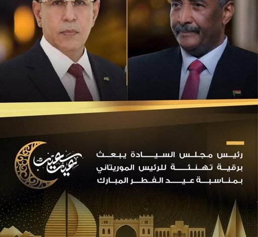 رئيس مجلس السيادة الانتقالي الفريق أول الركن ‫عبدالفتاح البرهان‬ يبعث برقية تهنئة لرئيس جمهورية موريتانيا صاحب الفخامة محمد ولد الغزواني , بمناسبة عيد الفطر المبارك
