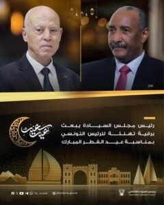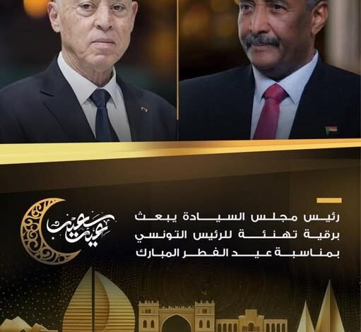 رئيس مجلس السيادة الانتقالي الفريق أول الركن عبدالفتاح البرهان يبعث برقية تهنئة لرئيس جمهورية تونس صاحب الفخامة قيس سعيّد ، بمناسبة عيد الفطر المبارك