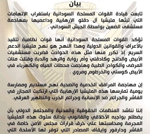 وأكدت القوات المسلحة أنها قوات نظامية تتقيد بالأعراف والقوانين الدولية وهذا النهج هو نهج مليشيا الدعم السريع إذ تكرر منها مثل هذه الحوادث فضربت مستشفيات الأبيض والدلنج وكادقلي وأم روابة والرهد والدبة وقتلت مئات المرضى والكوادر الطبية وهاجمت محطات المياه والكهرباء في الأبيض كوستي والخرطوم ومروي.