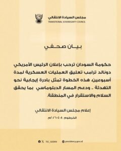 مجلس السيادة الانتقالي | بيان صحفي | ترحيب بتعليق العمليات العسكرية في الشرق الأوسط