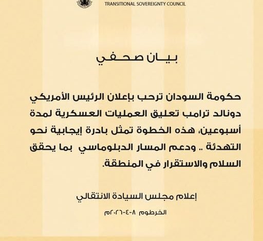 حـكــومـة الســودان ترحب بإعلان الرئيس الأمريكي دونالد ترامب تعليق العمليات العسكرية لمدة أسبوعين، هذه الخطوة تمثل بادرة إيجابية نحو التهدئة. ودعم المسار الدبلوماسي بما يحقق السلام والاستقرار في المنطقة.