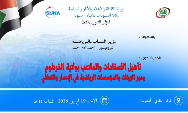 يستضيف المؤتمر التنويري رقم (52) لوزارة الثقافة والإعلام والآثار والسياحة الذي تنظمه وكالة السودان للأنباء “سونا” في تمام الثانية عشرة من ظهر غد الاحد الموافق ١٩ أبريل ٢٠٢٦، السيد وزير الشباب والرياضة البروفيسور احمد ادم احمد للحديث حوّل تأهيل وإعداد الاستادات والملاعب بولاية الخرطوم، ودور الهيئات الشبابية والمؤسسات الرياضية في الإعمار والتعافي وذلك وذلك بالمركز الثقافي بأمدرمان.