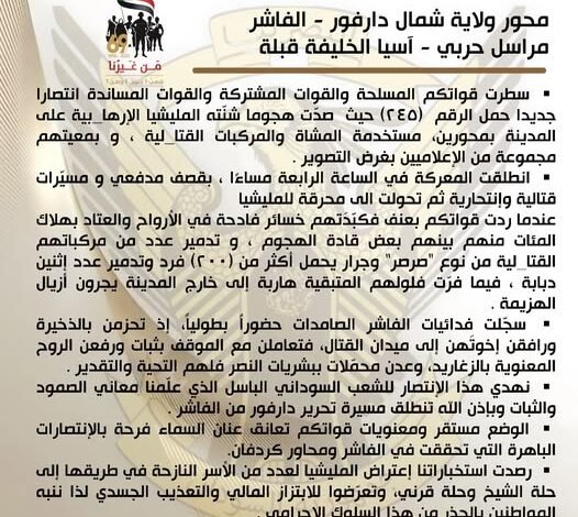 ▪︎ نهدي هذا الإنتصار للشعب السوداني الباسل الذي علّمنا معاني الصمود والثبات وبإذن الله تنطلق مسيرة تحرير دارفور من الفاشر .