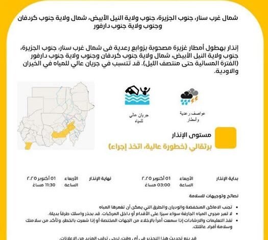 أصدرت الهيئة العامة للأرصاد الجوية اليوم إنذاراً باللون البرتقالي من خطورة عالية في كل من شمال غرب سنار، جنوب الجزيرة، جنوب ولاية النيل الأبيض، شمال ولاية جنوب كردفان وجنوب ولاية جنوب دارفور، حيث يُتوقع هطول أمطار غزيرة مصحوبة بعواصف رعدية قد تتسبب في جريان عالي للمياه في الخيران والأودية .