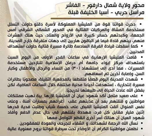 ▪︎ دحرت قواتنا قوة من المليشيا المملوكة لأسرة دقلو حاولت التسلل مستخدمة المشاة والمركبات القتالية في المحور الشمالي الشرقي أمس الجمعة، وكبدتهم خسائر كبيرة في الأرواح والعتاد، حيث هلك العشرات منهم، بينهم قادة فيما فر الباقون هاربين إلى جهات متفرقة خارج المدينة.