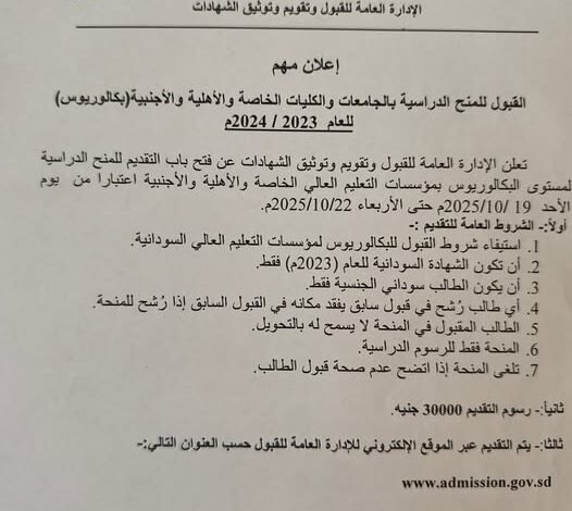 وشددت الإدارة على أن المنحة تلغى فوراً إذا تبين عدم صحة قبول الطالب أو وجود أي بيانات غير صحيحة، مضيفة أن رسوم التقديم حددت بمبلغ 30,000 جنيه سوداني، داعية الطلاب الراغبين إلى الإسراع في استكمال إجراءاتهم عبر الموقع الإلكتروني الرسمي للإدارة العامة للقبول على الرابط:
