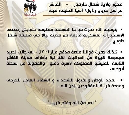 ▪︎ كذلك دمرت قواتنا منصة هاون عيار (١٢٠)، إلى جانب تحييد مجموعة كبيرة من المركبات القتا_لية بأطراف مدينة الفاشر التابعة للمليشيا المملوكة لأسرة دقلو والممولة من سلطة أبوظبي .