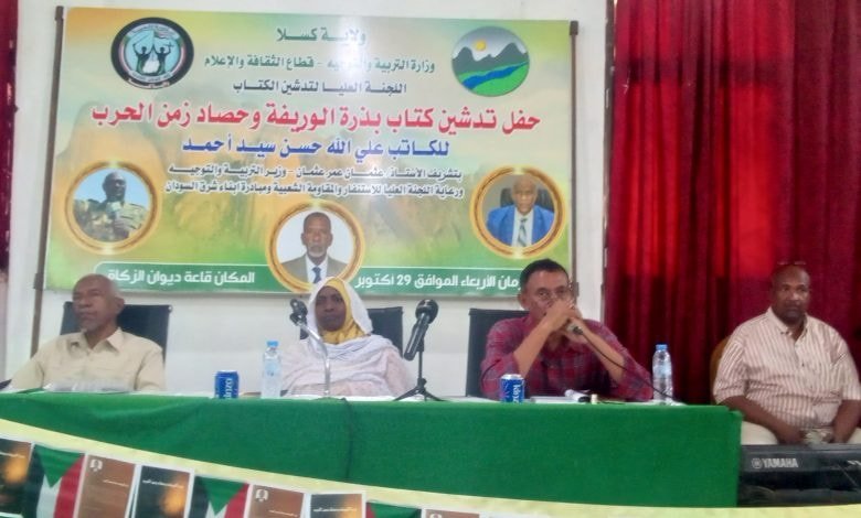 نظمت اللجنة العليا للاستنفار والمقاومة الشعبية بولاية كسلا بالتعاون مع مبادرة أبناء شرق السودان برنامجا اليوم بقاعة ديوان الزكاة بولاية كسلا لتدشين كتاب”بذرة الوريفة وحصاد زمن الحرب” لمؤلفه الأستاذ على الله حسن سيد أحمد عضو اللجنة المالية باللجنة العليا بحضور قيادات قطاع التوجيه بوزارة التربية والتوجيه بالولاية وجمع غفير من المهتمين بالشأن الثقافي.