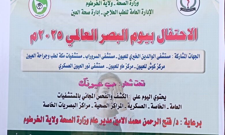 مدير عام وزارة الصحة بولاية الخرطوم الدكتور فتح الرحمن محمد الأمين عبر عن سعادة بتدشين اليوم العالمي للبصر من داخل مستشفى الوالدين بعد إعادة تشغيله وذلك بمشاركة واسعة من الجهات المعنية بطب العيون على مستوى القطاعين الحكومي والخاص مؤكداً حرص الوزارة على استمرار تقديم الدعم الفني والإداري للمستشفيات ذات التخصصات الدقيقة والنادرة لضمان استقرار الخدمات العلاجية بولاية الخرطوم .