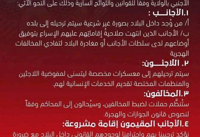 أ/ من وُجد داخل البلاد بصورة غير شرعية سيتم ترحيله إلى بلده ب/ الأجانب الذين انتهت صلاحية إقاماتهم عليهم الإسراع بتوفيق أوضاعهم لدى سلطات الأجانب أو مغادرة البلاد لتفادي المخالفات