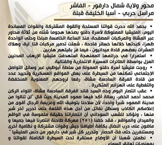 ▪︎ عقب انتصار اليوم وجّه السيد قائد الفرقة السادسة مشاة، اللواء الركن محمد أحمد الخضر، رسالة أكد فيها صمود المدينة حيث قال “لن تنالوا من مدينة الصمود شبراً واحداً، لأن سلاحنا بتوفيق الله وعزيمة الرجال أقوى من إعلامكم الكاذب وسنظل نقاتل من أجل هذه القلعة حتى تحرير آخر شبر منها ، ونؤكد للشعب السوداني أن انتصاراتنا حقيقة ملموسة فقد خضنا (٢٥١) معركة انتصرنا فيها جميعا و ماضون على درب النضال يدا واحدة جيش وقوات مشتركة و نظامية أخرى ومستنفرين حتى فكّ الحصار وتحرير كل شبر في دارفور من دنس المليشيا “.